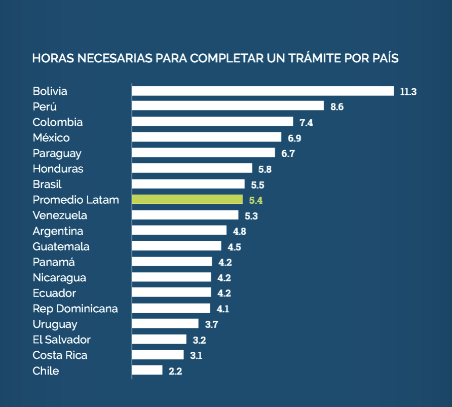Según un nuevo estudio del Banco Interamericano de Desarrollo (BID), El Fin del Trámite Eterno: Ciudadanos, Burocracia y Gobierno Digital , completar un solo tramite lleva en promedio 5,4 horas en la región, pero en algunos países tarda más de 11 horas. Prestar trámites presenciales cuesta al gobierno hasta 40 veces más de lo que podría costar el servicio equivalente en una plataforma digital, pero actualmente sólo tres países, Brasil, México y Uruguay tienen más de la mitad de sus trámites disponibles en línea. En la Unión Europea es posible empezar el 81% de los trámites en línea. En América Latina, la cantidad de trámites digitales es mucho menor lo que contribuye a que solamente el 7% de las personas reporte haber hecho su último trámite en línea.